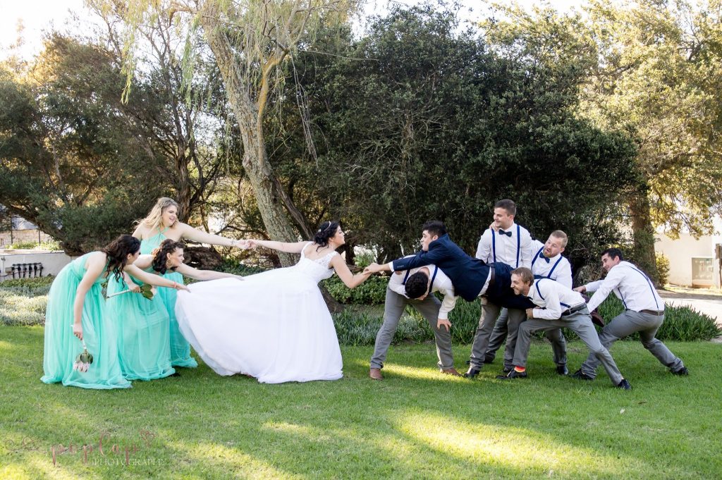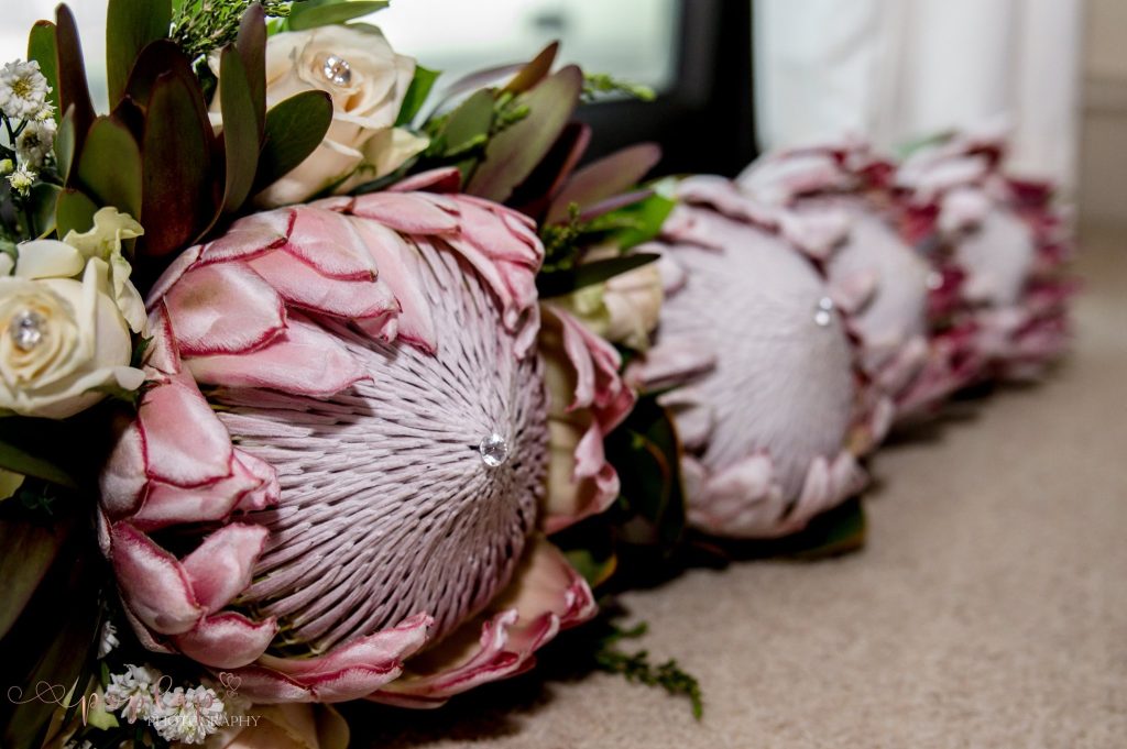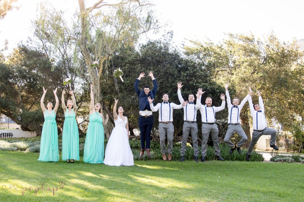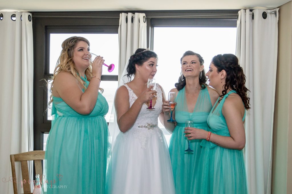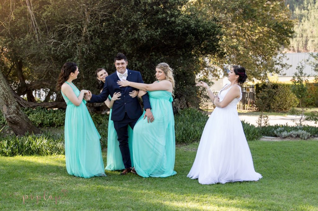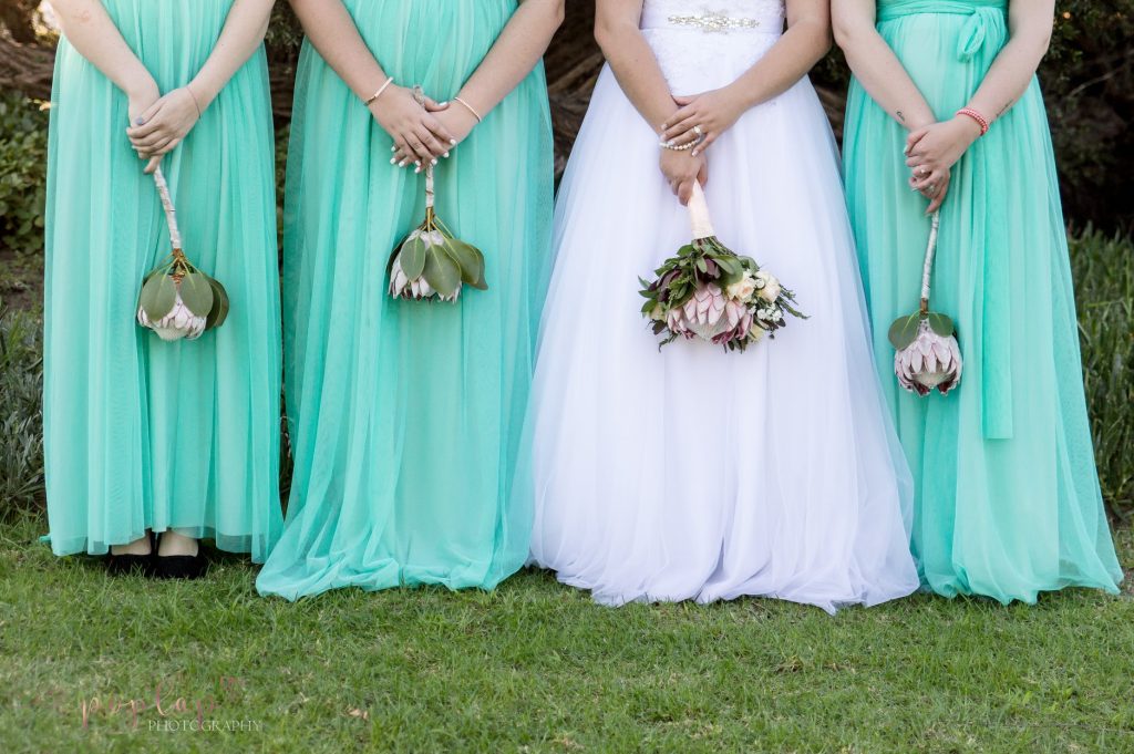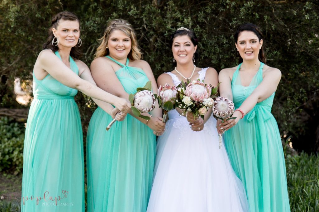 The Houw Hoek Hotel wedding styling featured a romantic combination of soft pink décor with teal/green bridesmaid dresses.