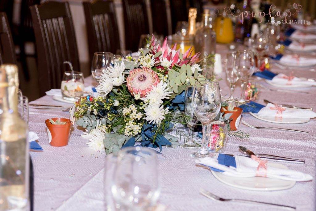 Decor by Kolping Guest House incorporated soft tones with natural textures, including eucalyptus leaves and stunning floral arrangements featuring white, blue, and pink flowers with touches of protea.
