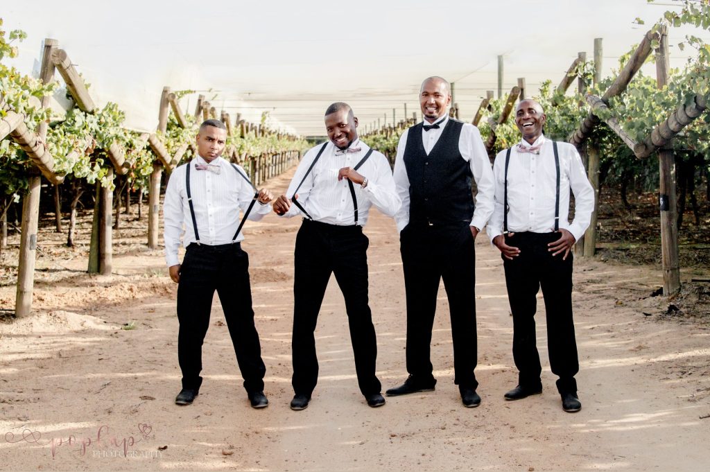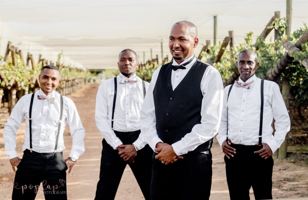 Lindford and his groomsmen wore classic black suits from Mr Suits Hire, timeless, sharp, and perfectly balanced against the softer colour palette of the day.