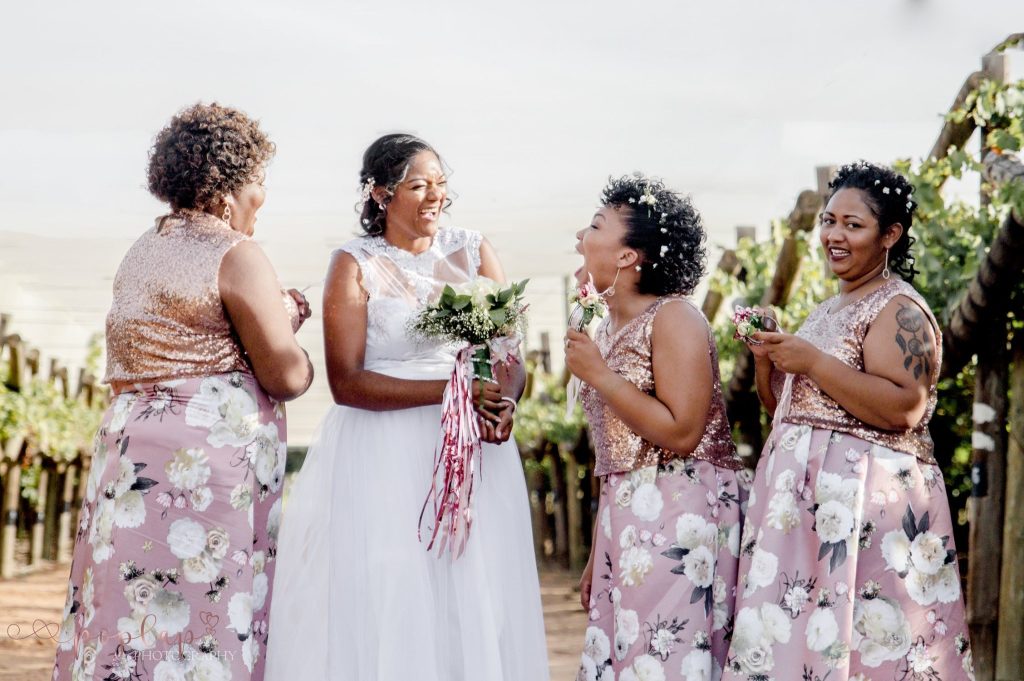 Her bridesmaids wore flowy, floral summer dresses in blush tones, adding a fresh and relaxed feel to the wedding aesthetic. The flower girl, dressed by Melissa Davids, completed the look with a soft and charming touch.