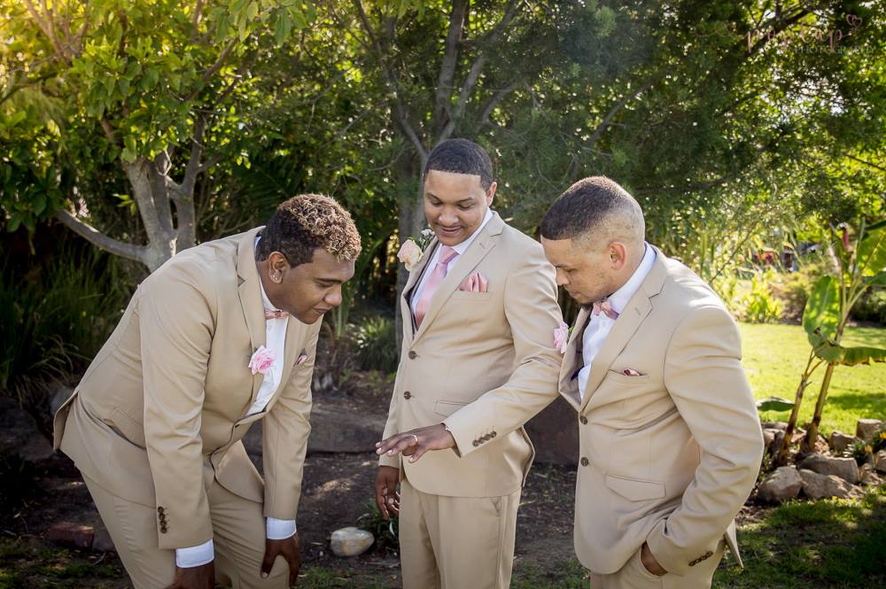 The groomsmen wore light brown suits, while the bridesmaids matched in elegant light brown dresses, creating a cohesive and modern look.