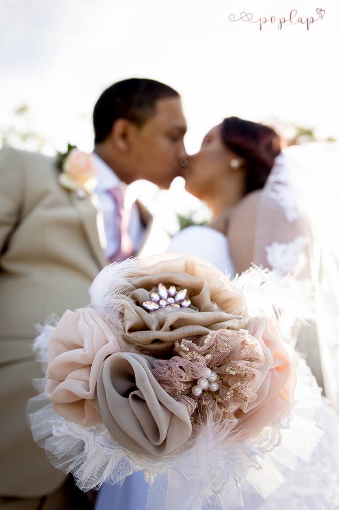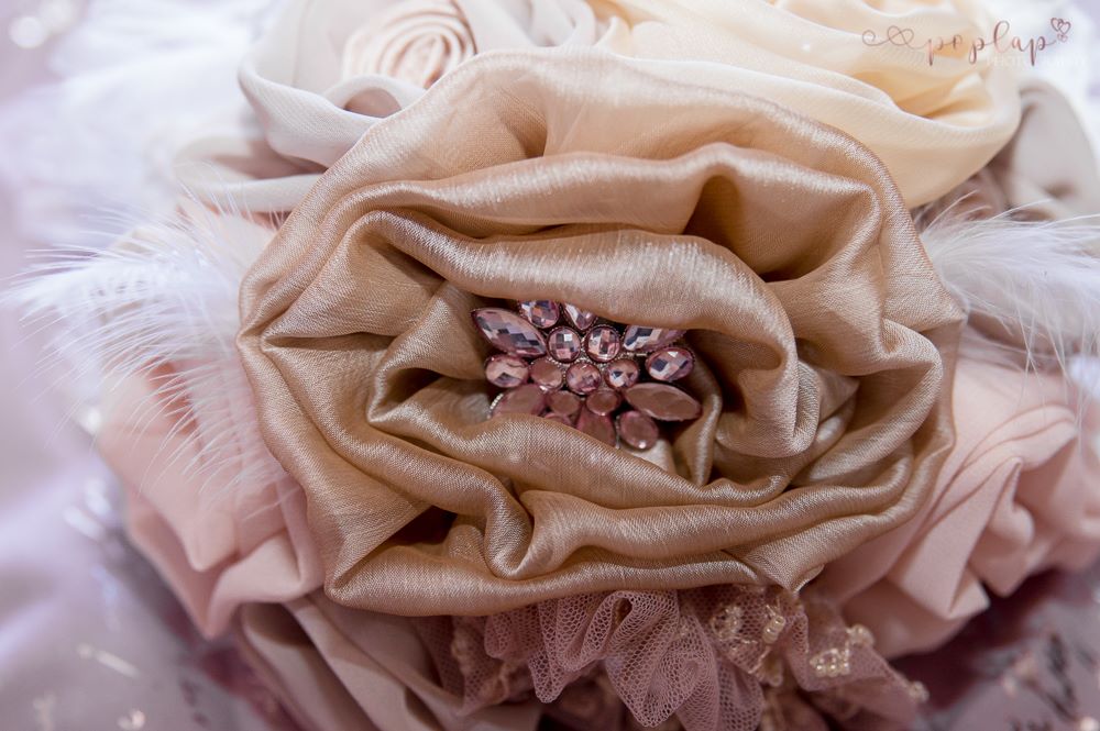 One of the most unique elements of this wedding was the use of material flowers for the bridal bouquet.